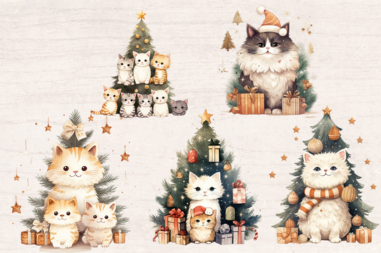 5 Watercolor Christmas tree Cat PNG cliparts bundle, Christmas Cliparts