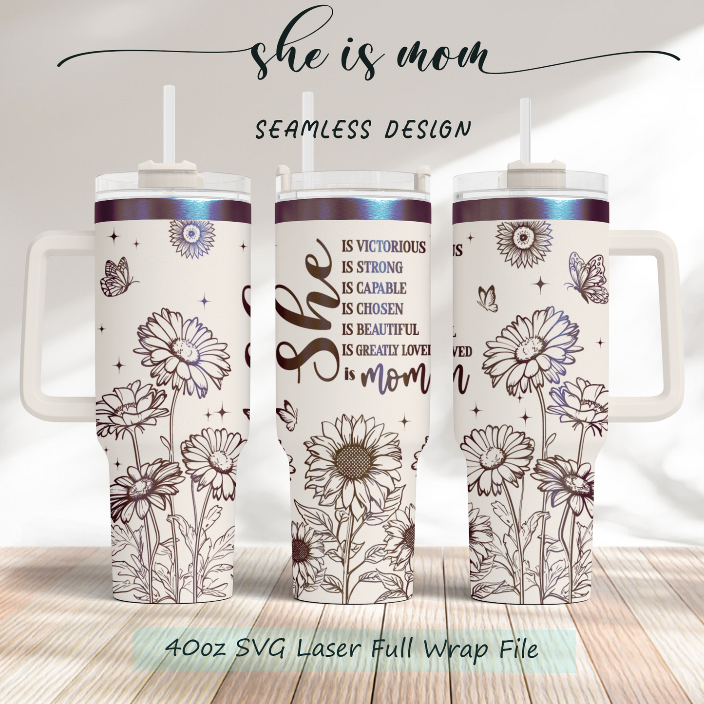 She is Mom, Bible Verse Self Affirmation sunflower, Christian 40oz Tumbler SVG Laser Engraved Full Wrap Seamless, Rotary and PNG sublimation